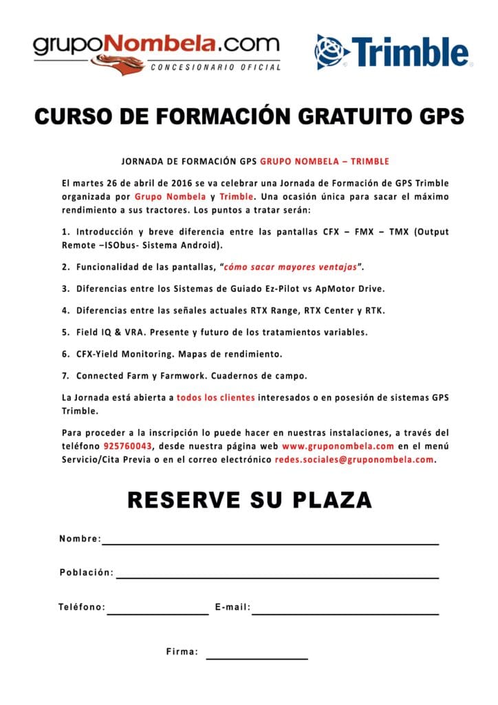 El martes 26 de abril de 2016 se va celebrar una Jornada de Formación de GPS Trimble organizada por Grupo Nombela y Trimble. Una ocasión única para sacar el máximo rendimiento a sus tractores. Los puntos a tratar serán: